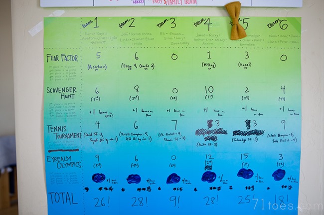 we also switched it up this summer a bit by having the entire reunion function as a big, friendly competition. all family members were broken into six teams and each team could earn points from different events. it was a really fun way to mix up the dynamics, and a really useful tactic to get people to be on time - bonus points for promptness work in a family full of competitive spirits! :)